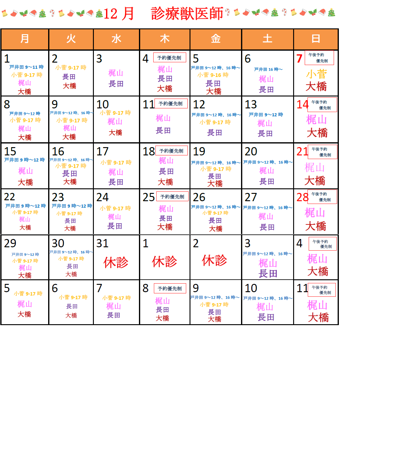 12月・1月前半の獣医師&混雑予想カレンダーです☆